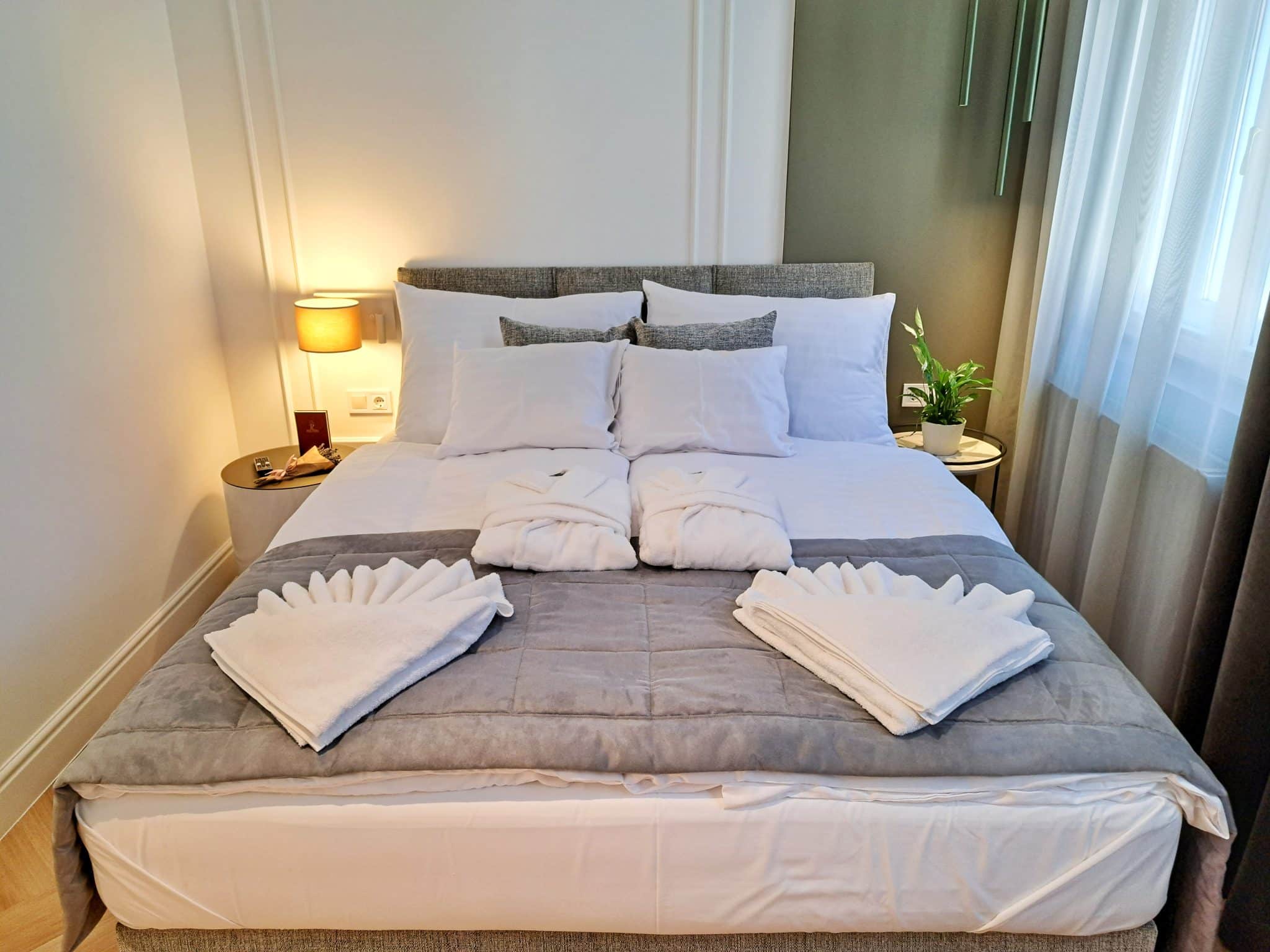 Deluxe lakosztályaink tökéletes környezetet biztosítanak a kikapcsolódásra, kényelemre és pihenésre vágyó vendégeink számára. Nagy alapterületű lakosztályaink valódi kislakásoknak is beillenek. Zárt sarokerkélyes tágas nappalival, különálló, saját televíziós hálószobával és fürdőszobával rendelkeznek. A nappaliban modern gépesített konyha, hat személyes étkező asztal, valamint egy kényelmes kihúzható kanapé is található. Ideális választás lehet a családdal, vagy barátokkal érkezők számára. Kialakításának köszönhetően akár üzleti tárgyalások helyszíne is lehet. Elhelyezkedéstől függően gyönyörű kilátás nyílik a romantikus Mosoni-Duna sétányra, illetve a történelmi óváros sétálóutcájára.
