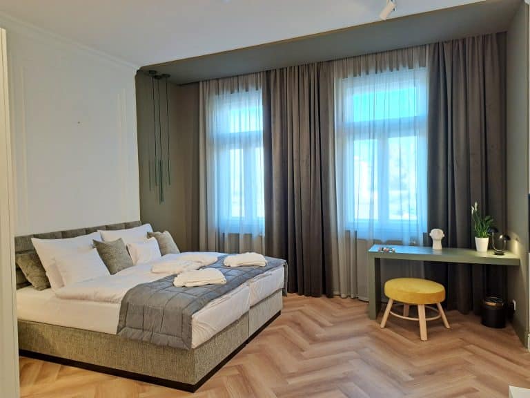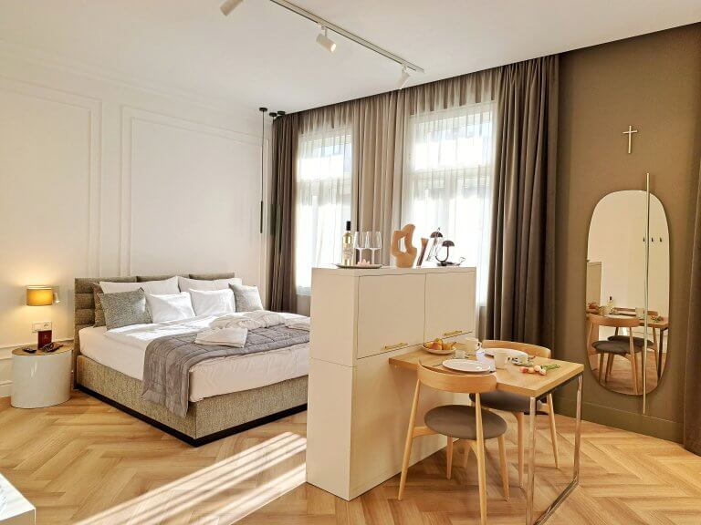 Panoráma szobáink letisztult formavilágú bútorzattal és berendezési tárgyakkal biztosítanak megfelelő környezetet a kikapcsolódásra. A tágas kialakítású szobák ideálisak egy vagy két fő kényelmes elhelyezésére, kétágyas, illetve franciaágyas kialakítással. A szobákban modern gépesített konyhapult, síkképernyős televízió, nagy sebességű WiFi áll rendelkezésre. Vendégeink gyönyörködhetek a történelmi óváros sétálóutcája nyújtotta páratlan kilátásában.